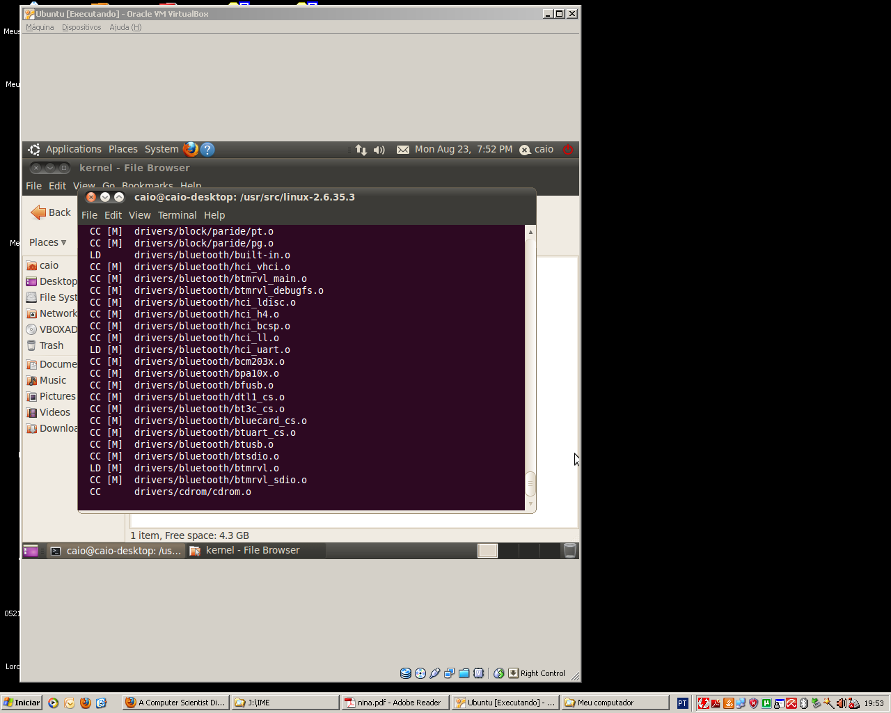 Passos para compilar o kernel linux-2.6.35.3.tar.bz2 dentro do Ubuntu (ubuntu-10.04.1-desktop-i386.iso) com VirtualBox 3.2.8 rodando no Windows como host (VM).