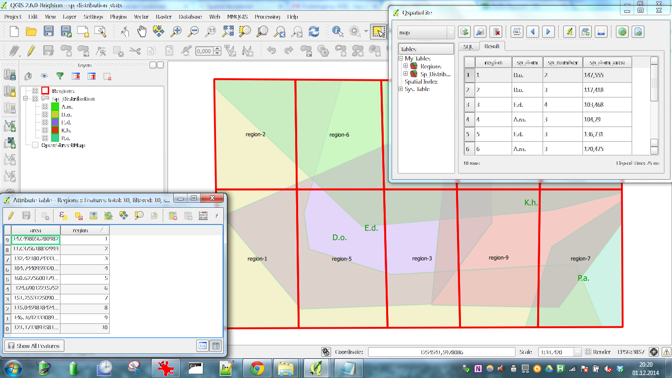 Since QGIS now makes import/export and querying of spatial data easy, we can use the spatiaLite engine to join the intersection of both layers to the region table and then aggregate this intersections by applying max- and count-function on each region. We'll also keep the identity and the area-value of the species with the largest intersecting area.