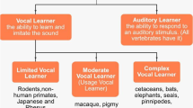 The first gene to be definitively linked to human speech and language was the transcription factor forkhead box P2 (abbreviated FOXP2 when referring to the human protein, FoxP2 when referring to the protein in non-human animals, and FoxP2 when referring to the mRNA form) [7]. Individuals possessing a mutation in this gene suffer from impaired orofacial fine motor control and deficits in language processing, as well as abnormal morphology and dysfunction in brain regions related to speech motor control such as the basal ganglia and Broca’s area [8, 9]. Following this discovery, FoxP2 has been extensively studied in avian vocal learning pathways, wherein its differential expression has been found to facilitate vocal flexibility in a variety of developmental and social contexts [10,11,12,13,14]. Knockdown of FoxP2 in juvenile male zebra finches (Taeniopygia guttata) results in inaccurate vocal imitation and thus has been shown to prevent proper song development [15]. Also in this species, studies have shown that FoxP2 mRNA expression increases in the striatal vocal control nucleus Area X during the juvenile sensorimotor learning period when song is nearing adult “crystallized” song [10] and is downregulated in Area X, relative to the adjacent striatum, when adult males sing in the absence of a female, producing more variable song syllables—during what is thought to be vocal “practice”—compared to when singing is directed towards a potential mate [16].