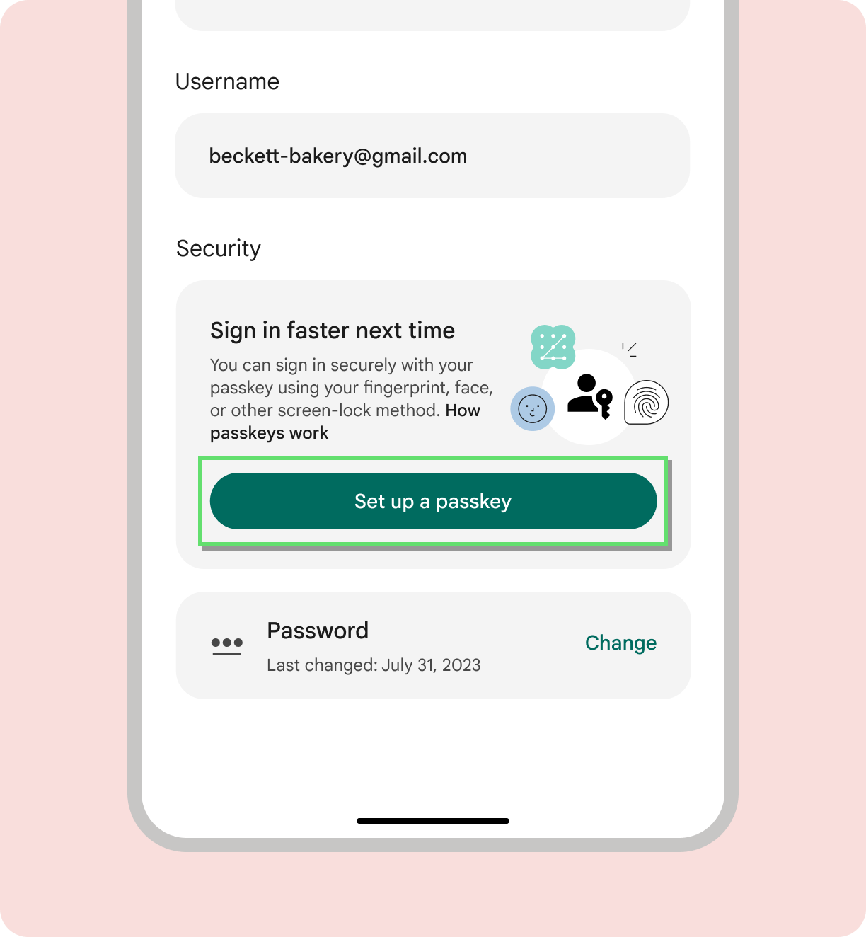- المستخدمون الحاليون: الترويج لإنشاء مفاتيح المرور أثناء استرداد الحساب بعد تسجيل الدخول باستخدام كلمة مرور، وضمن إعدادات الحساب، حيث يمكن للمستخدمين في عقلية إدارة الحساب بالفعل