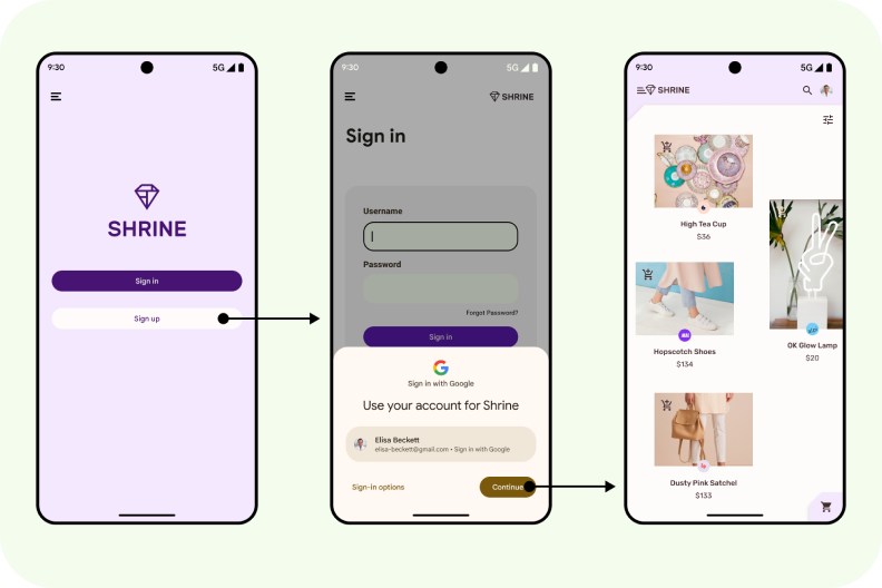 מפתחות גישה, שזמינים דרך Credential Manager, משפרים את חוויית המשתמש על ידי כך שהכניסה לחשבון קלה ומאובטחת יותר. הם עמידים בפני פישינג ואי אפשר לעשות בהם שימוש חוזר. המשתמשים יכולים להיכנס לחשבון על ידי ביטול הנעילה של המכשיר באמצעות טביעת אצבע, זיהוי פנים או קוד אימות מקומי, במקום לזכור סיסמה ולהקליד אותה.