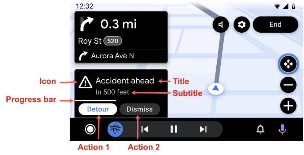 AlertNavigationTemplate 内でのみ使用できます。NavigationTemplate の外部でユーザーに通知するには、通知を表示するの説明のとおり、ヘッドアップ通知(HUN)の使用を検討してください。