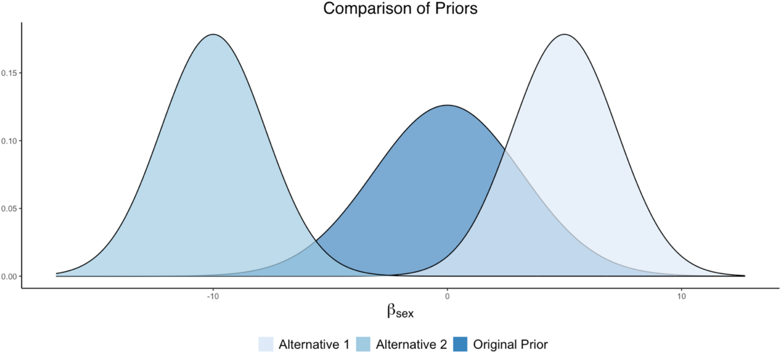 The researcher comes up with a set of “competing” priors to examine; we will describe what this set of priors can look like in the examples below. The point here is not to alter the original priors. Rather, it is to examine how robust the original results are when the priors are altered, and the model is re-estimated.1 It can also be a method used to identify priors that would serve as a poor choice for the model or likelihood—an issue we expand on more in the discussion.