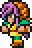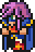 Faris has two distinct appearances: the in-game sprite and the artwork design. The in-game Faris has long, loose purple hair with a green headband and green eyes. She wears a dark blue sleeveless jacket with gold piping and a paler blue tunic with a gold belt that has a red jewel, similar to her sister's. Over the shoulders, Faris wears a baggy green shawl hiked up on the shoulders and secured with a red stone brooch. She has brown leather bracers on the forearms and matching boots.