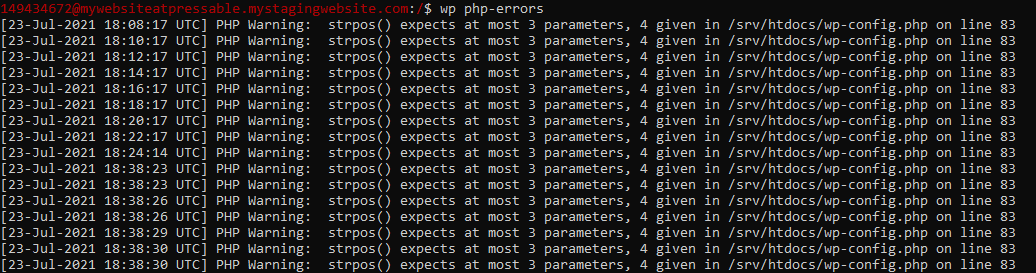 You can also access the PHP error log via SSH. To view the most recent PHP error log’s entries, you’ll need to enter the following command: wp php-errors