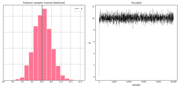 print(f"s2_posterior : {s2_posterior:.3f}")mu_prior : 5.000 s2_prior : 10.000 mu_posterior : 10.027 s2_posterior : 0.196