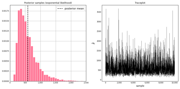Using Metropolis-Hastings, the mean of generated samples should match the posterior predictive mean obtained from the analytical expression (584.50 above). Adapting the sampling code from the previous model, an exponential distribution is used to generate proposals, since the exponential scale parameter must be strictly greater than 0. We have the following:
