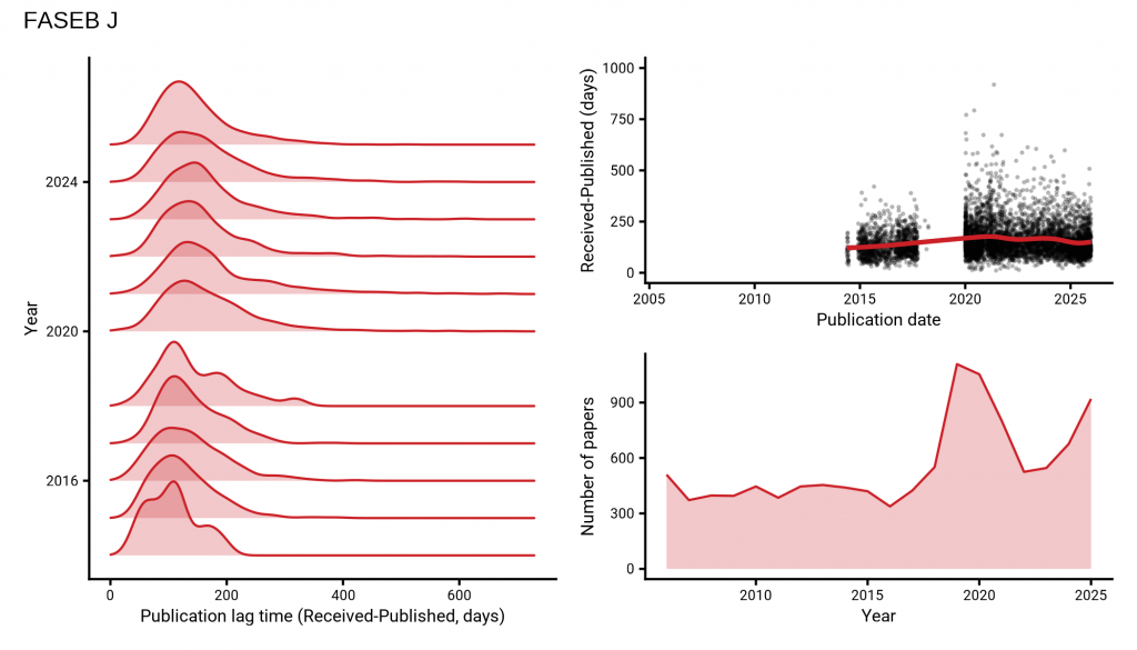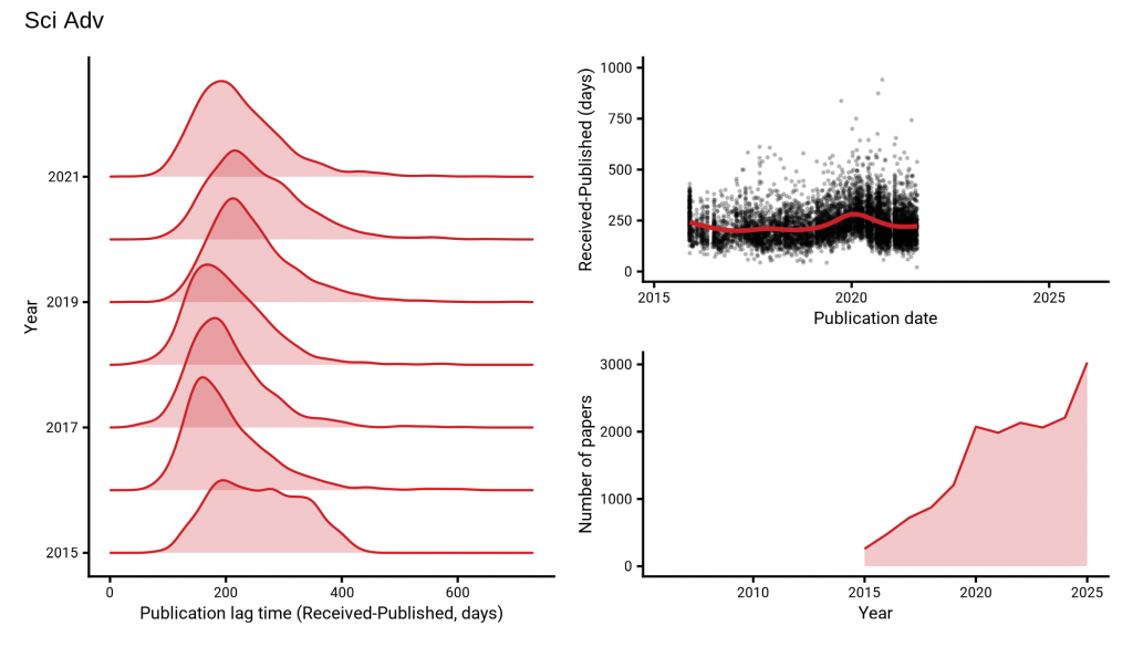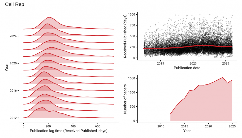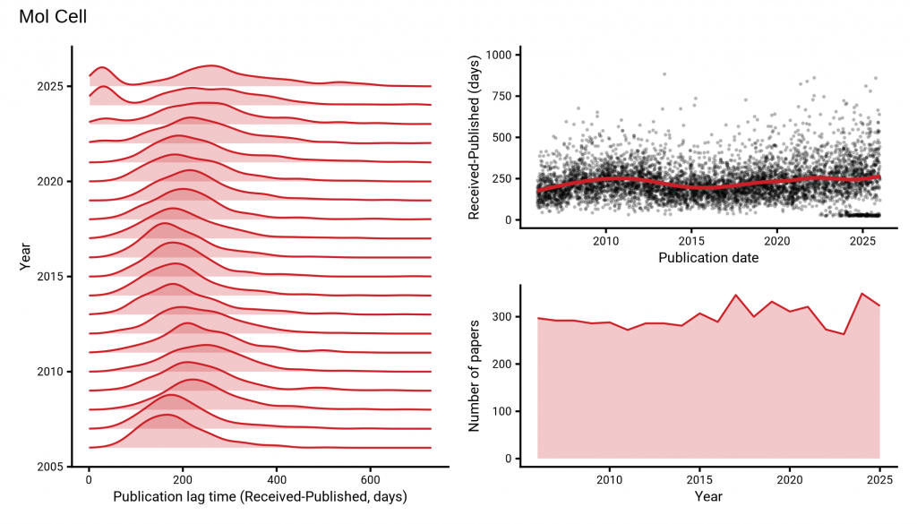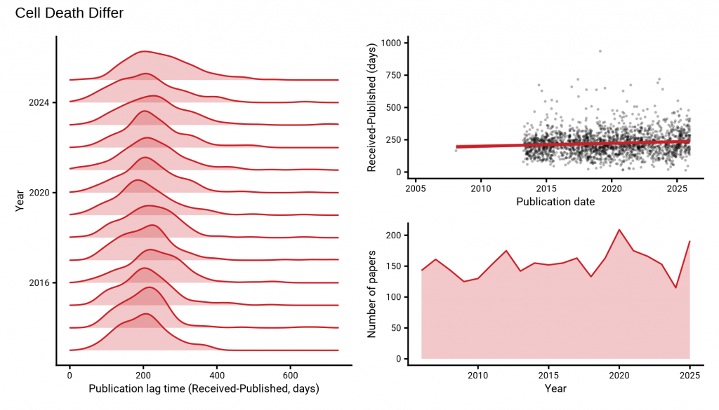 To click though in more detail, I made some graphics for each journal which use ridgelines to look at the profile of lag times for each year.