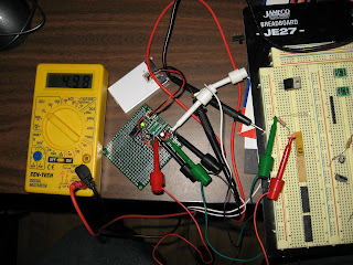 In any case above is the results of my first night. I built this step up converter out of the simple, but not widely available MAX856 and Eddy's new prototype board. Eddy's prototype board is kinda cool in that it some what mimics the layout of a regular breadboard. I wound up with about as many jumpers as one would on a breadboard, but I also didn't need to glob together pads with cold solder. It is a pretty nice board. I had just recently tried to build this circuit with a traditional isolated pad prototype board and, not unexpectedly, it did not work. Who knows where a glob went wrong? This board worked perfectly on the first try.