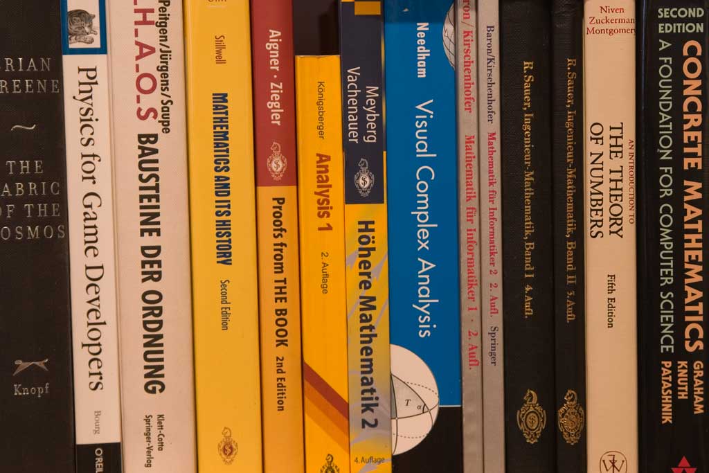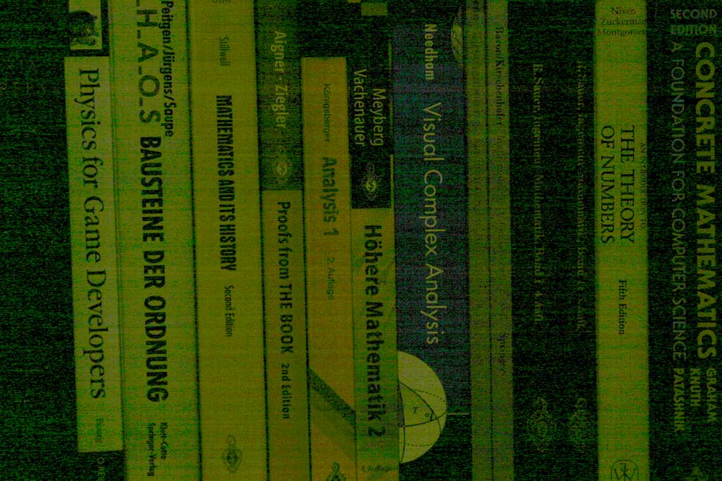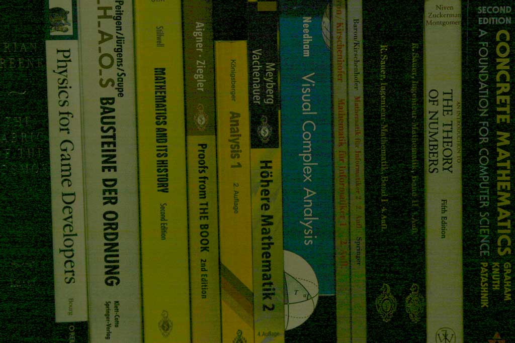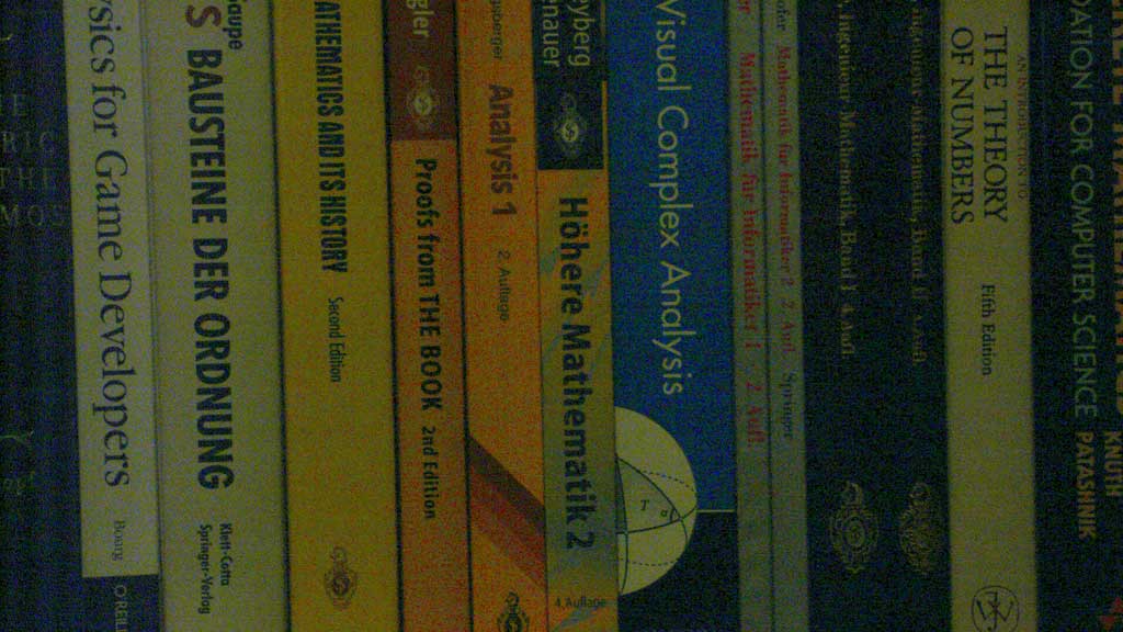 To this end I did the following: I set up a tripod in front of one of my bookshelves, determined the perfect exposure and then underexposed it by an increasing number of f-stops, shooting every exposure both RAW and JPEG on my Canon EOS 10D at ISO 100. All of them were taken at night with artificial light which did not change. This is how the scene looks like with the correct exposure (click for bigger version):