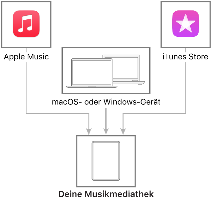 Stelle eine Verbindung zu deinem Mac- oder Windows-Gerät her, um Musik von deinem iPad auf ein anderes Gerät zu übertragen und sie zu aktualisieren. Um unterstützte Inhalte zu synchronisieren, verwende „Musik“ (macOS 10.15 oder neuer) oder iTunes (macOS 10.14 oder neuer und ein Windows-Gerät).