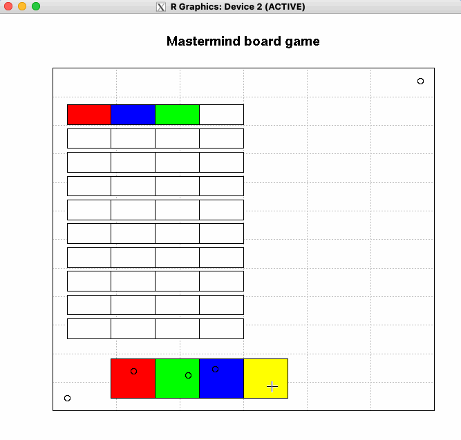 plot(c(100,500), c(100,500), xlab = "", ylab = "", xaxt = 'n', yaxt = 'n',main = "Mastermind board game")