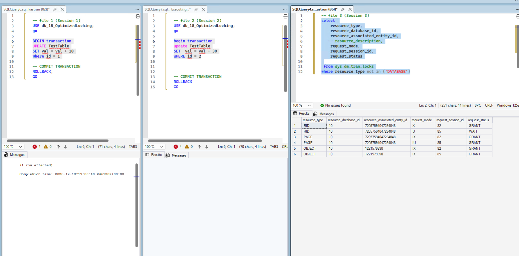 We will open three NEW queries and in each new file, we will copy / paste two concurrent update statements, the first will change the row with the ID = 1 (session 1) and the second one tries to change the row with the ID = 2 (session 2). In the last one (right pane – session 3) we placed the statement to show you the locks.