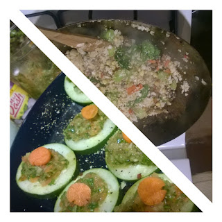 This experiment was not well received by Todd. I have to eat this myself. Veggie stir fried. I chopped cauliflower to look like rice and I made a salsa and put it on sliced cucumbers.