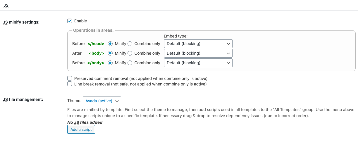 Before adding the files, we first need to configure the JS minify section in Performance>Minify>JS