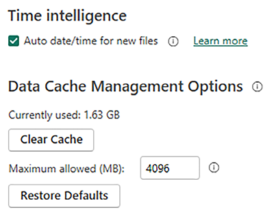 1. On the Data Load tab, under Data Cache Management Options, confirm that the currently used data cache is below the Maximum allowed (MB) setting. If it is near the limit and local disk space is available, increase the value of Maximum allowed (MB). Do not clear the cache unless local disk space is unavailable, as this will require additional, often unnecessary, queries to be executed.