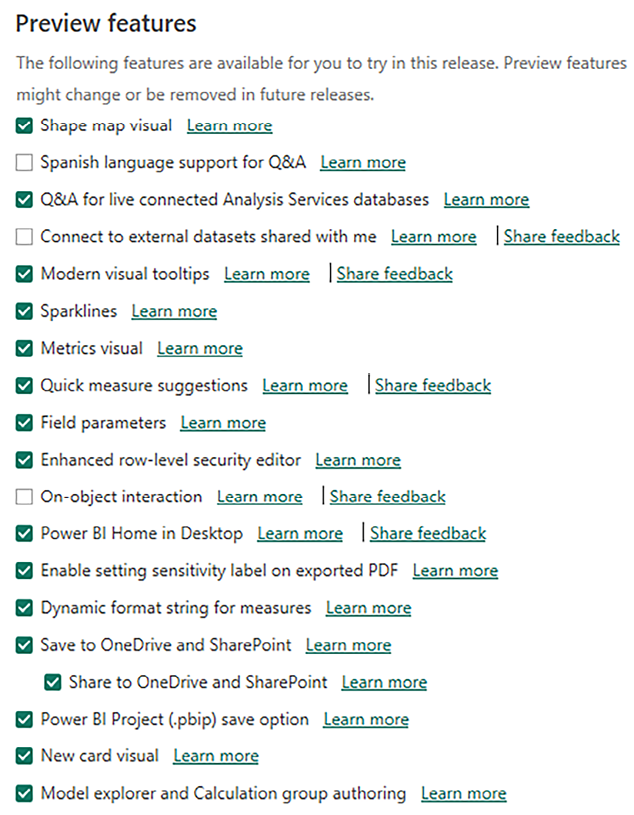 Power BI Desktop supports a rich set of configuration options both for the currently open file and all instances of Power BI Desktop on the given device. These options control the availability of the preview and end user features and define default behaviors’ resource usage, security, and privacy/isolation of data sources.