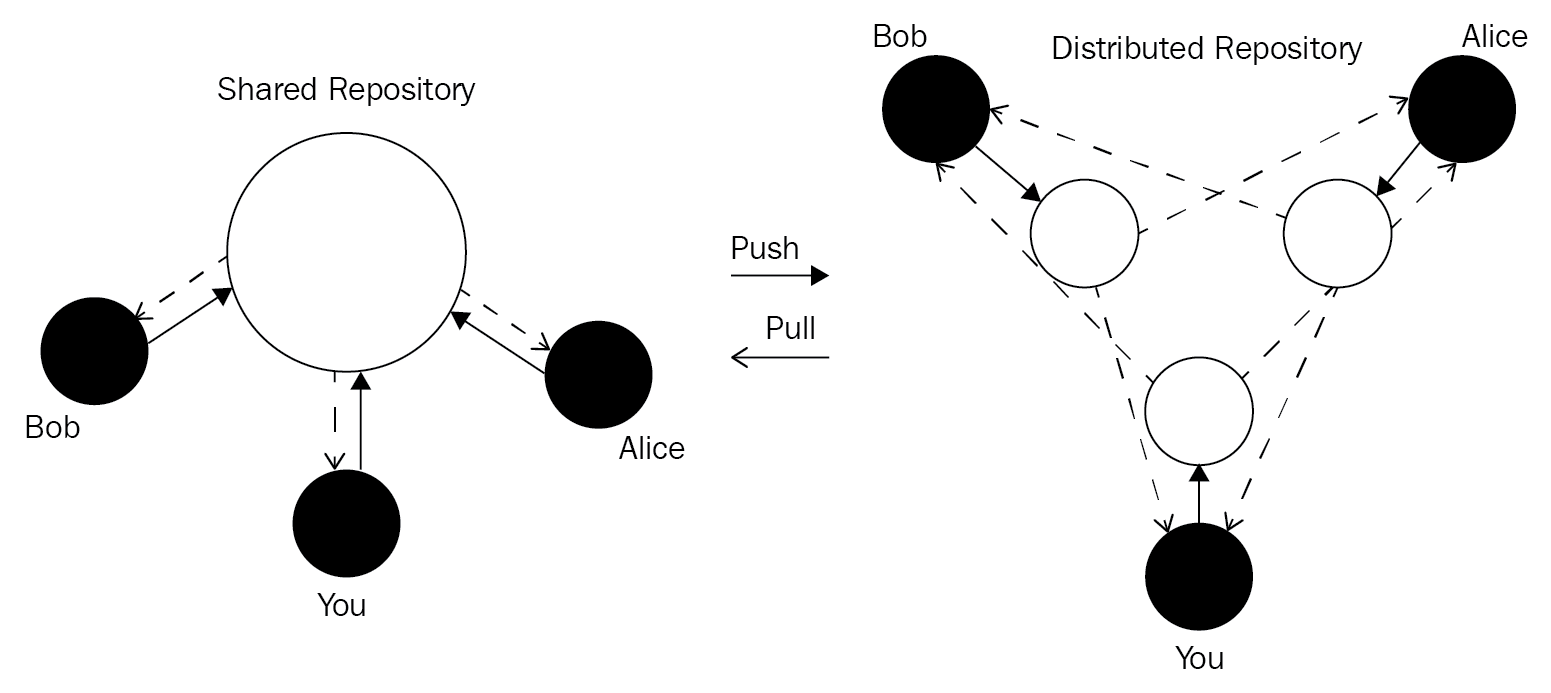 Like CVS, the biggest difference between Git and SVN is that SVN follows a centralized architecture, while Git uses a distributed network. There is one SVN server, and as a client you communicate your changes with it. This in different to Git, where there can be many local copies, and one copy can reside on a central server. This architecture is depicted as follows: