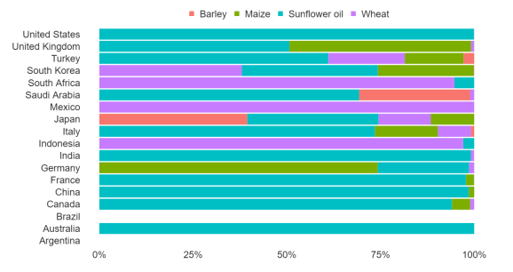 It seems that sunflower oil is the most dominant imported cereal crop; specifically, when we hover over China, we see that %86.47 of the domestic supply was acquired from those countries in 2019. And it is clear that Brazil and Argentina do not need those crops arriving from Russia and Ukraine.
