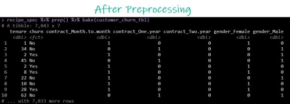 Before preprocessing we have predictors like “contract” containing factors (categories) and unnecessary columns like “customer_id” that won’t help us predict.