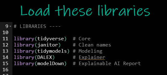 Load tidyverse , janitor, tidymodels, DALEX and modelDown. I’ll explain the importance of each of these R packages as we use them.