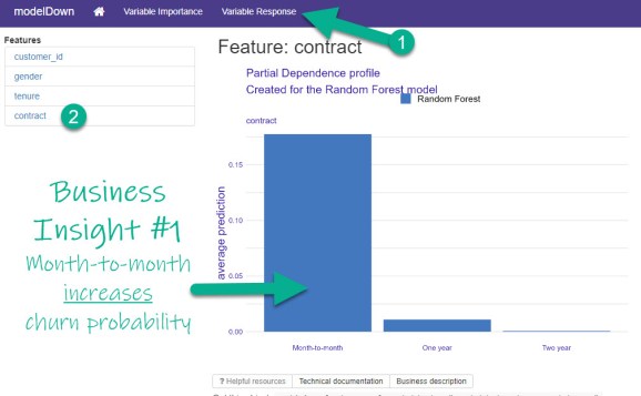 The feature importance plot is quite simply a visualization that identifies the top features in your modelDown report. I can see that “contract” and “tenure” are my top 2 features.