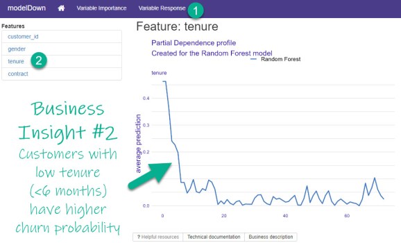 In Step 1 above, I also saw that “tenure” was an important feature. On the Variable Response Tab, I select “tenure”, and this leads me to my second Business Insight.