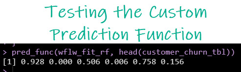 We can test our custom prediction function using our trained tidymodels workflow. By running on the head (first 6 rows of our dataset), I can truncate to the first 6 predictions. Looks like it’s working.
