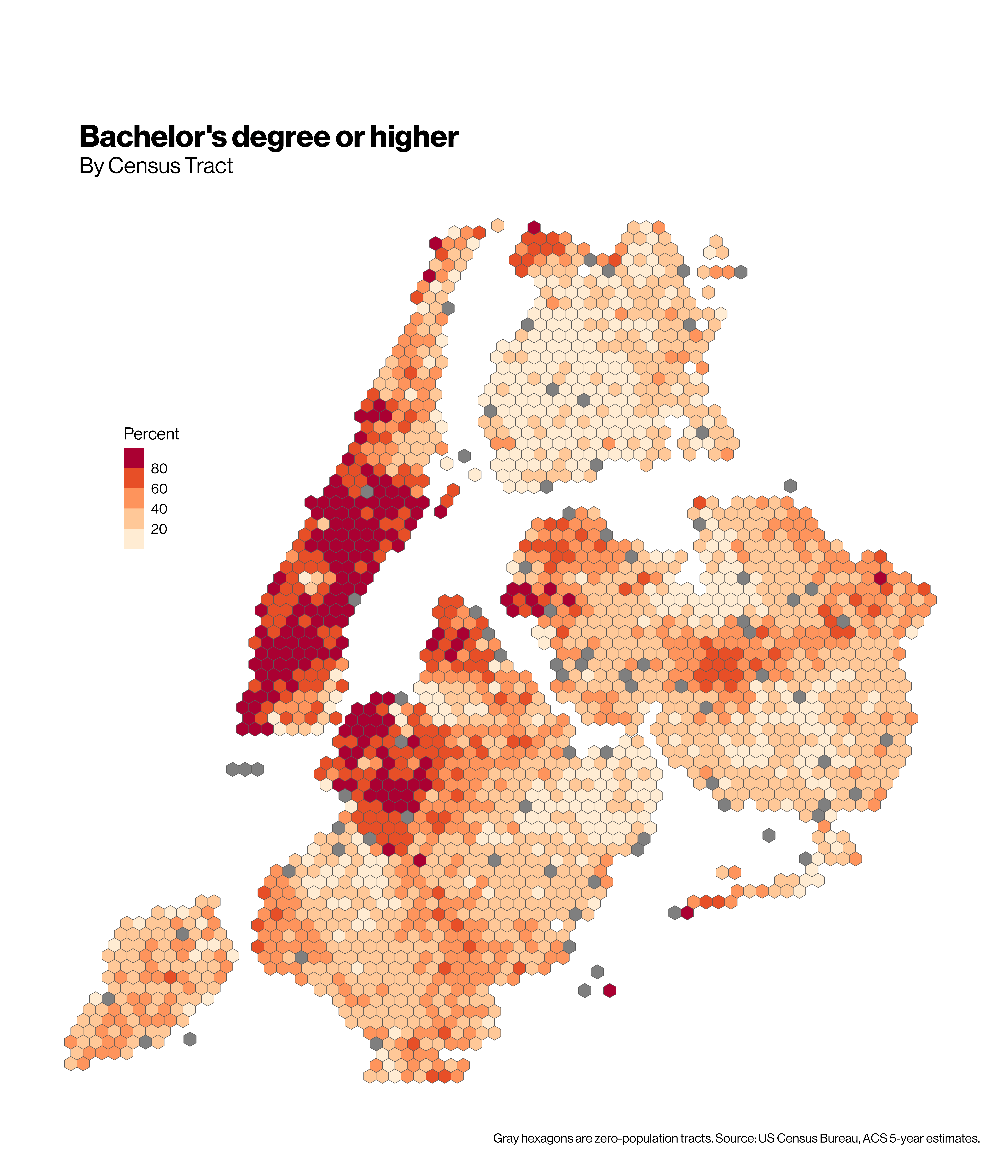 The usual benefits and disadvantages of regularized choropleths are in evidence here. Lower Manhattan’s population gets a fairer shout, as do parts of Brooklyn and the Bronx. The geography still mostly works. The difficulties flow mostly from the map being at the tract-level in the first place, rather than the tiling. That is, some tracts have unusual shapes that result in quite noisy estimates. For example, sometimes a tract will consist mostly of a park or an industrial area, but have a few residential segments. This can mean it ends up being measured too high or too low on the thing we’re counting. Or, by contrast, a tract might be almost entirely one kind of entity, like a retirement home, producing results that might seem odd if you don’t know what’s in that spot. You can see why the City aims at the NTA level for a lot of its summaries. It has ten times fewer units, but things get smoothed out in a way that may be more useful. Any real-world method of measurement comes with some rate of error, which the Census helpfully provides estimates of. Nice maps tempt you to reify observations and spin yarns about what you see, whether it’s a finely-detailed spatial polygon or a pleasingly regular hexagon. The finer the observational grain, the more important it is for you to know about the situation on the ground. Literally.