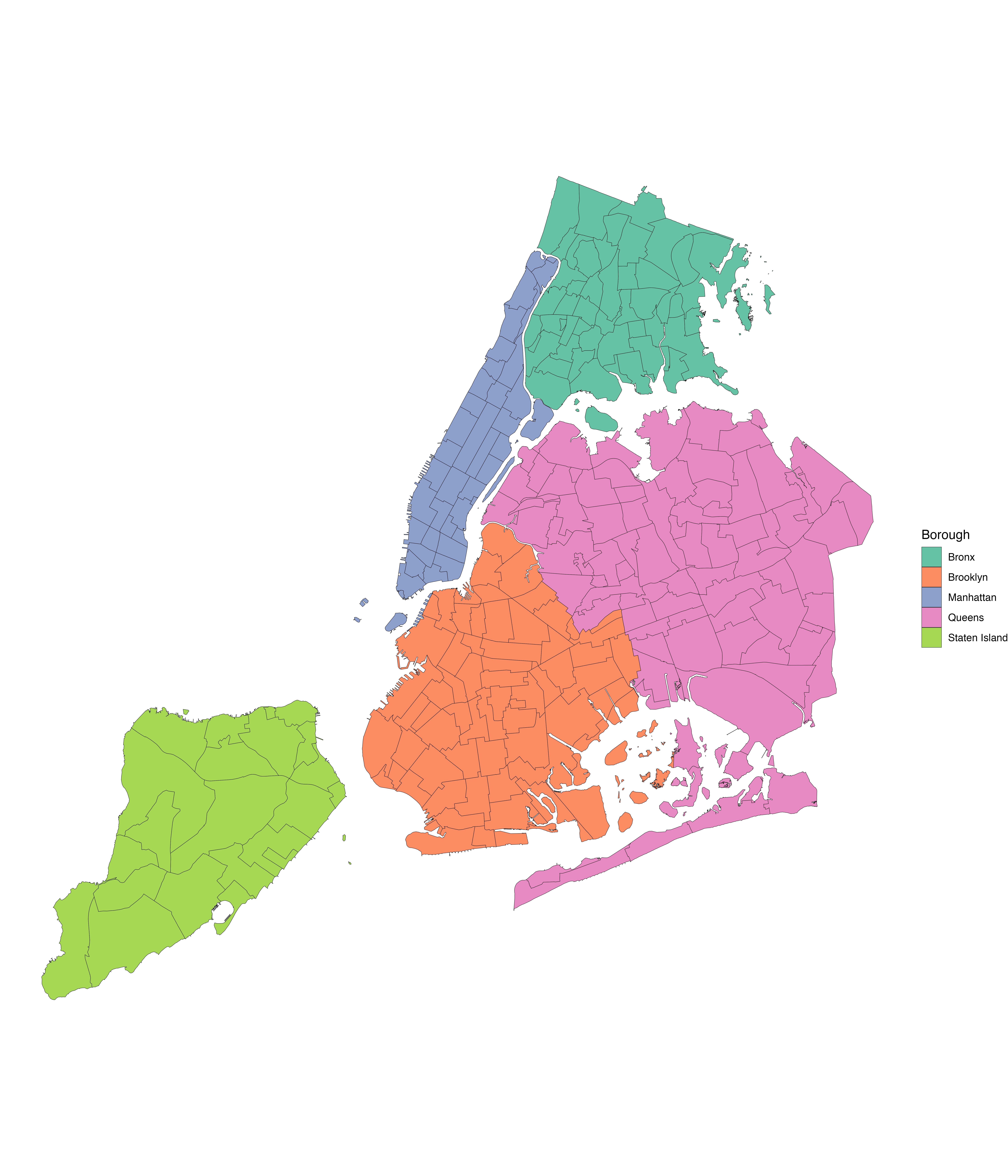 ggplot(nycmaps::nyc_nta20_sf) + geom_sf(aes(fill = boro_name), color = "black", linewidth = 0.1) + scale_fill_brewer(palette = "Set2") + labs(fill = "Borough") + theme_void() |