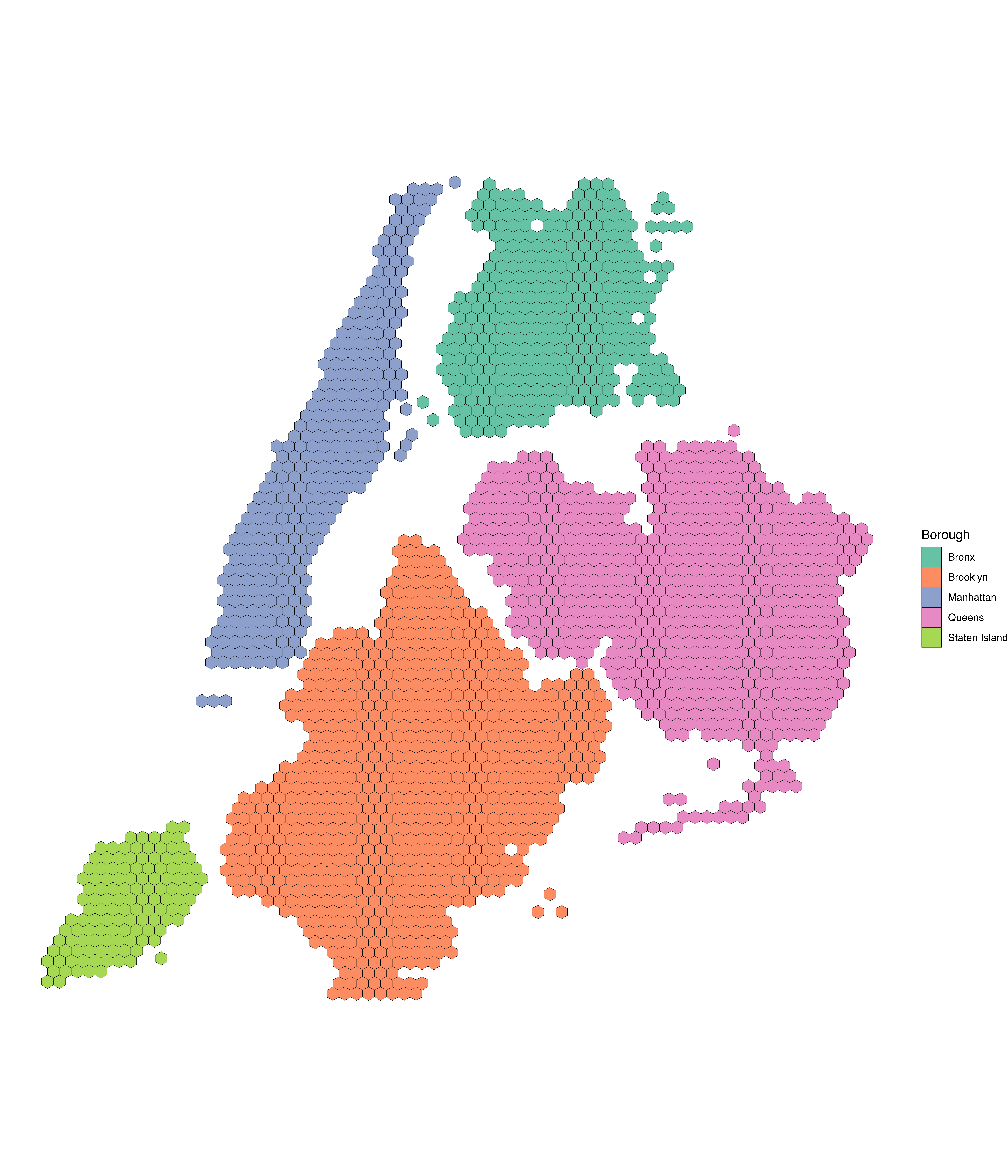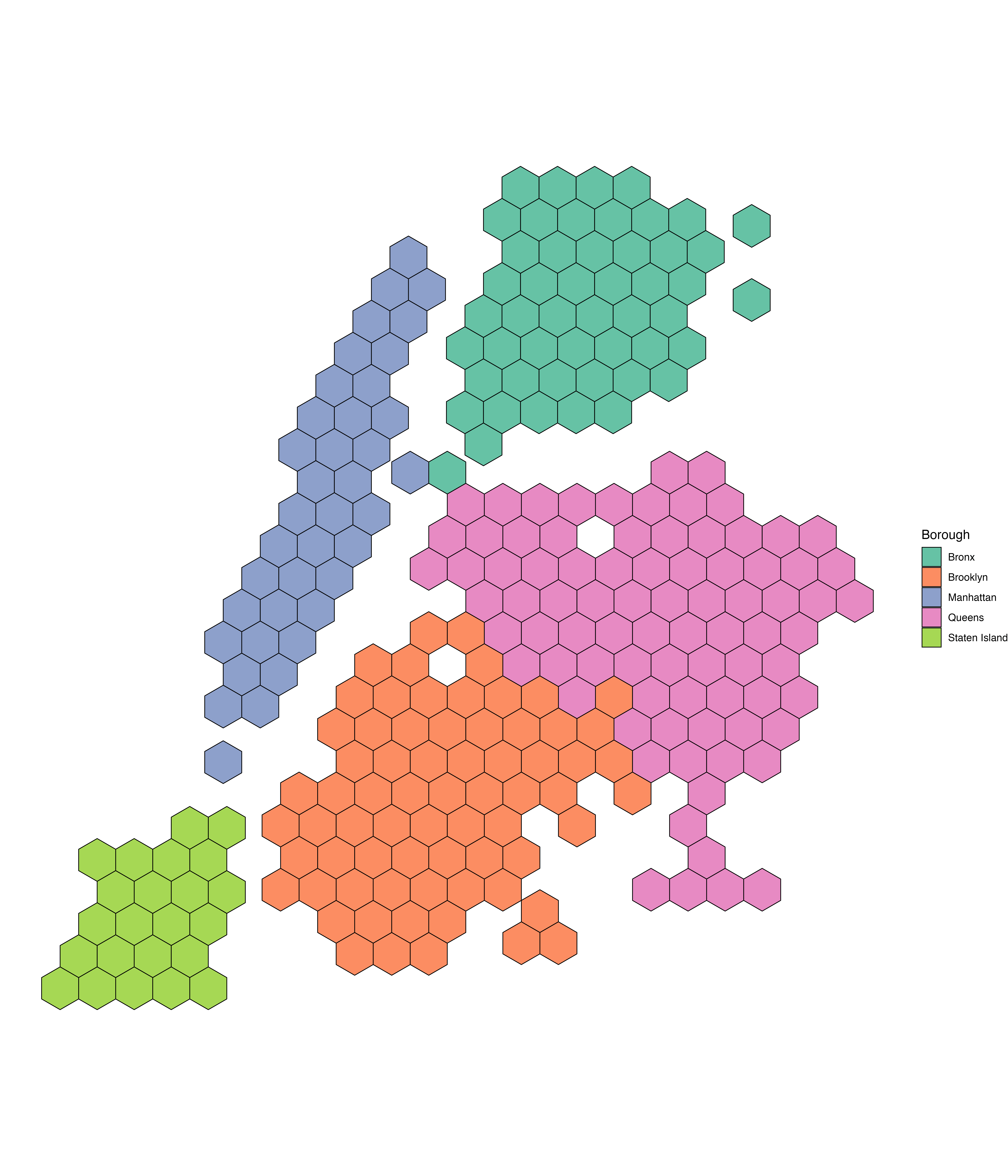ggplot(nychex::nyc_nta20_hex_sf) + geom_sf(aes(fill = boro_name), color = "black", linewidth = 0.3) + scale_fill_brewer(palette = "Set2") + labs(fill = "Borough") + theme_void() |