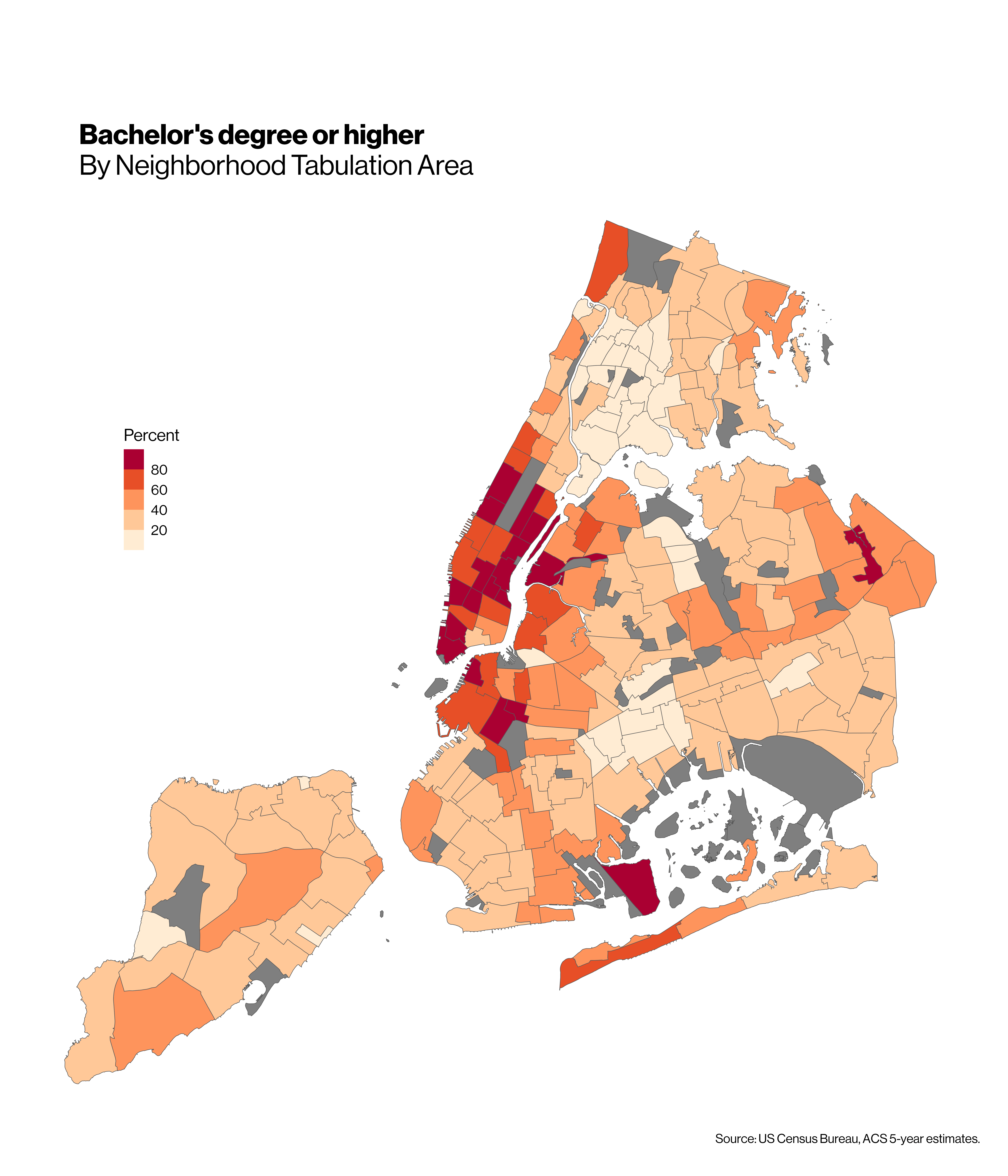 When we have a table like this, we can get tract-level data from the Census, for example on educational attainment, and aggregate it to the NTA level. Then we can join that data to the simple feature collection that has our geometries in it. With a little polishing (which you can read all about in what I personally think of as a very useful book), we get something like this: