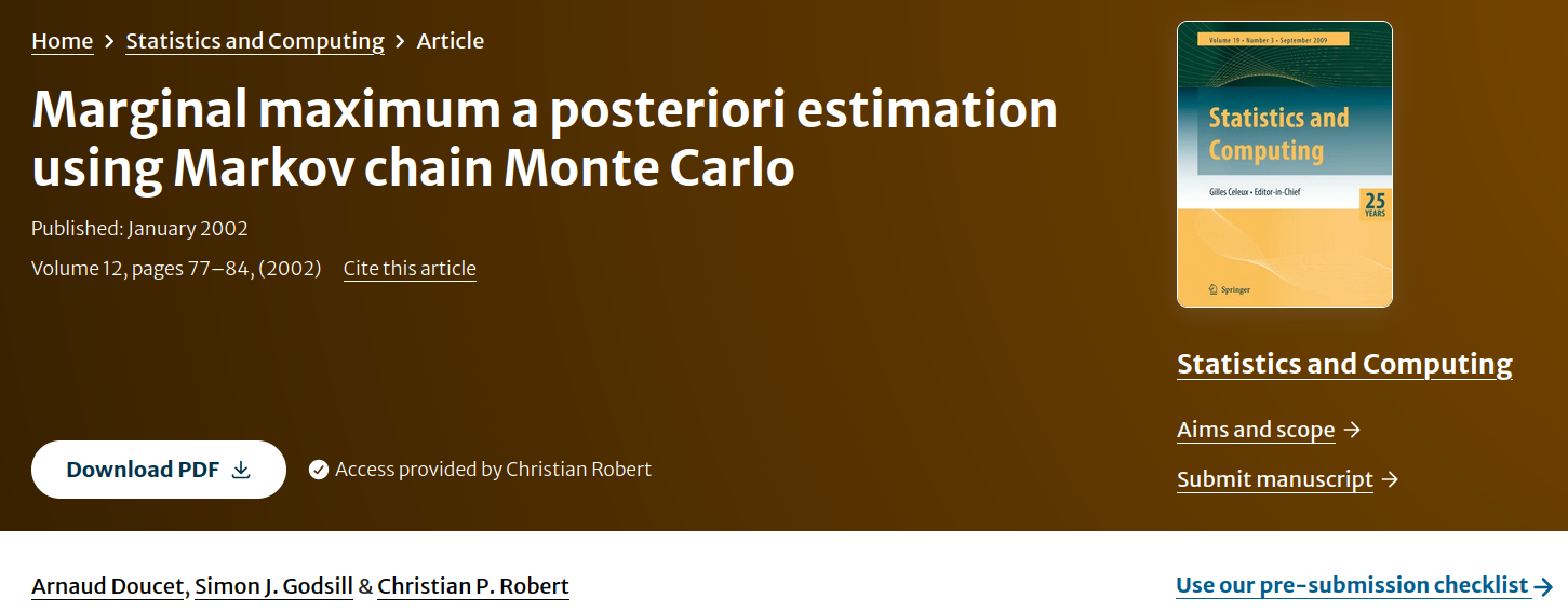 The first “mostly MCMC ” seminar (Season 2) had our new Ocean postdoc Tim Johnston, freshly graduated from the University of Edinburgh, involved in both talks, with proximal approximations for discontinuity! The first talk was given by Francesca Crucinio (formerly Warwick and formerly CREST, to point out potential COI!!), about the Proximal Interacting Particle Langevin algorithm (PIPLA) developed with her coauthors Paula Cordero Encinar, Deniz Akyildiz, Tim Johnston, and Mark Girolami, concerned with maximising likelihoods with latent variables (i.e., an EM setting). While offering one of many stochastic versions of EM, incl. simulated annealing, the solution they adopt very close to our SAME (2002) method, with duplicating latent variables N times to get near the marginal MAP (which as we noted differs from the join MAP). They start from interacting particle system with (unadjusted) Langevin dynamics, discretised over time, but the value of N does not move with iterations, which steps away from the simulated annealing motivation, thus requiring an evaluation of the error for a given N and possibly further runs with larger values of N. PIPLA is an extension of the above to non-differentiable targets, by using a proximity map, in continuation of MY-ULA [for Moreau-Yoshida] by Pereyra (2016), yet again fixing both N and the proximal parameter λ. With non-asymptotic convergence results requiring strong assumptions on the target.