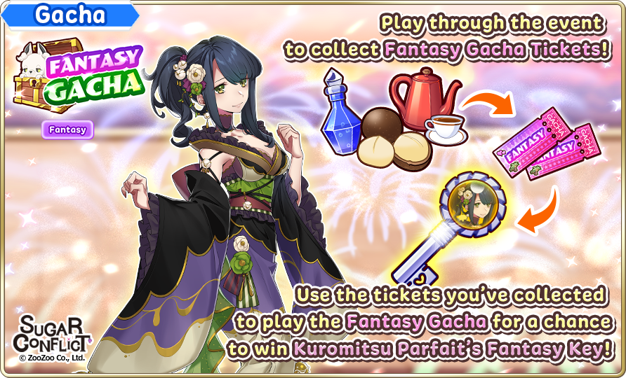Dieses Gacha bietet dir die Chance, den Kuromitsu Parfait Fantasy Key zu ergattern und eine besondere Geschichte mit der Café-Dienstmagd Kuromitsu Parfait zu erleben! Außerdem erhältst du für jeden Gacha-Pull eine Bonus-Gacha-Münze, die du auch gegen Fantasy Keys eintauschen kannst!