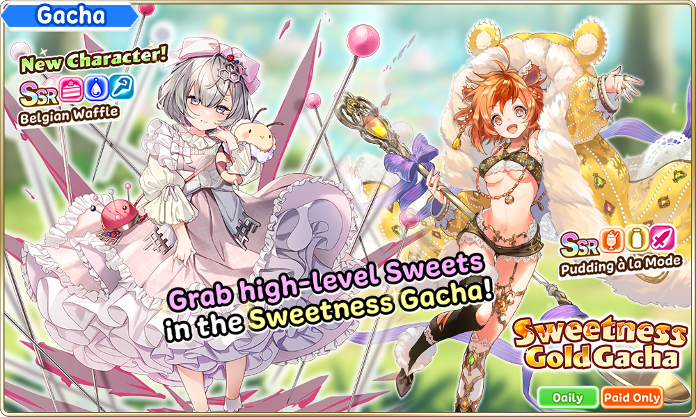 Das Sweetness Gacha hat jetzt brandneue Preise … in Form von SSR Belgian Waffle und SSR Pudding à la Mode. Jetzt aber nicht lange überlegen, du weißt, dass du sie in deinem Team brauchst!