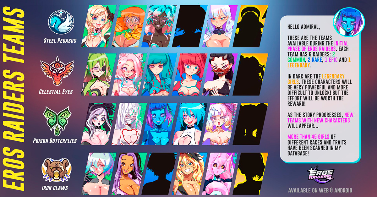 Eros Raiders has an anime art style with very vivid and electric colors.All the girls, both in design, color, animations... It is created by our team of professional artists.The Mechas and their animations, as well as the combat backgrounds, are also designed by 3D artists!